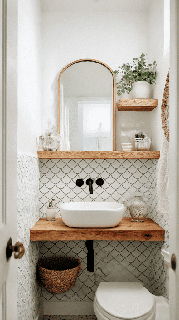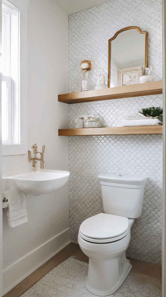 First, find your focal point. In a half bathroom, limited square footage means every inch counts. Choose a wall that’s immediately visible upon entering the room. This is where your scalloped shelf belongs—it sets the stage for everything else. Imagine walking into a compact space where your eyes are instantly drawn to a beautifully styled shelf featuring your favorite succulents and chic bathroom essentials.