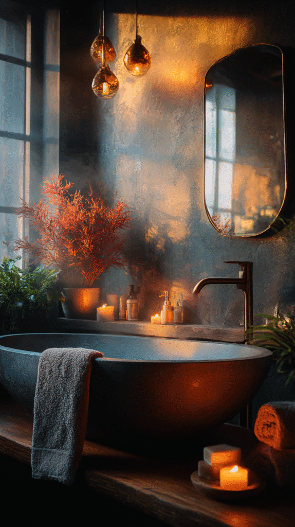 Without the right lighting, a moody bathroom can feel gloomy. The key is to layer your lights. Start with wall sconces, add pendant lights, and don’t forget about candles for a soft, flickering glow.