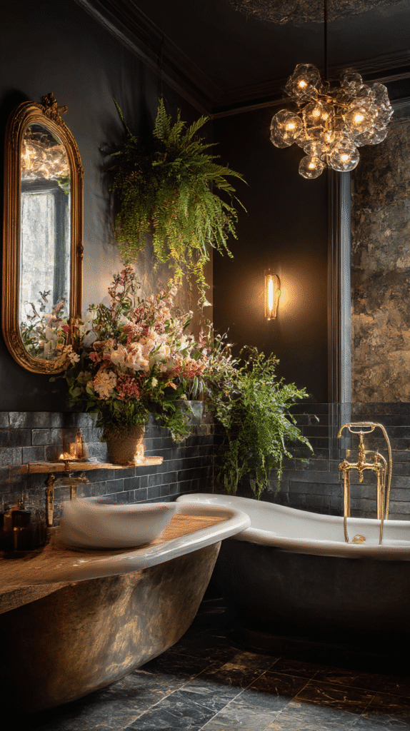 Vintage elements add a timeless quality to your moody bathroom.