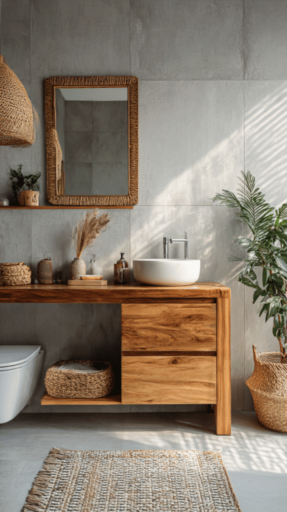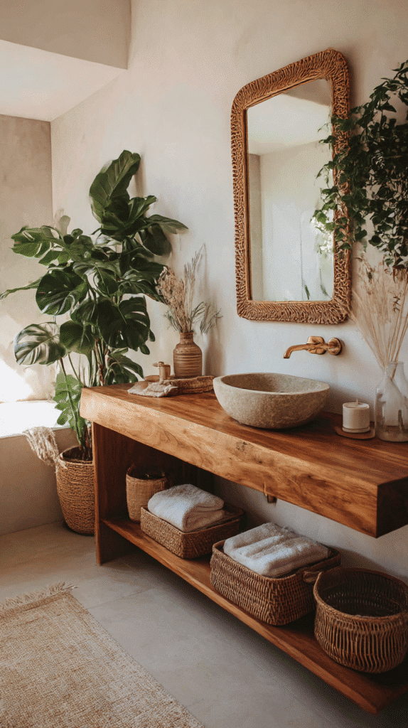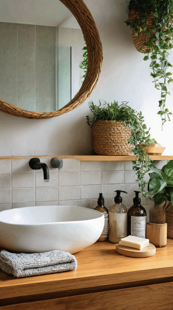 An earthy bathroom thrives on the presence of organic decor. First, think of introducing live plants that thrive in humidity. Plants like the Peace Lily or Boston Fern purify air naturally and add a lush, vibrant touch. Hanging macrame planters or natural rattan baskets can add an extra earthy texture.