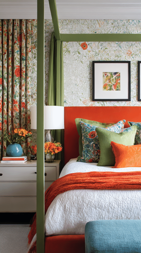 Creating an eclectic bedroom with orange, green, and blue doesn’t have to be a daunting task. Here’s how it plays out: