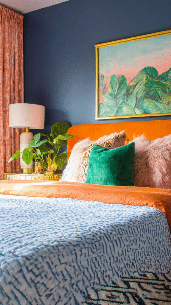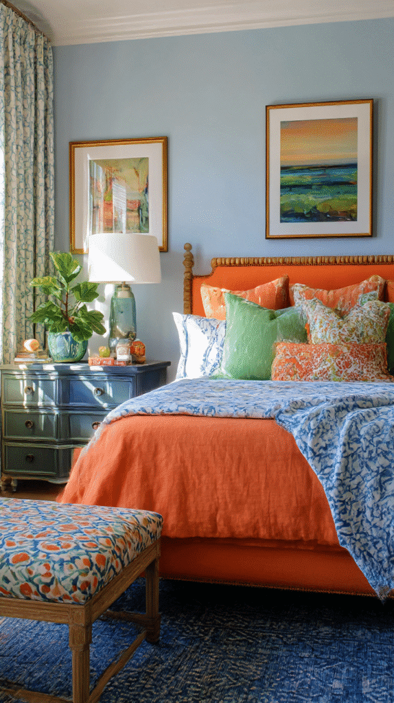 To create an eclectic bedroom that cleverly interweaves these colors, start with selecting a focal point. Maybe it’s an orange headboard or a statement wall. Adding throw pillows, artwork, or even a plush rug in varying shades of blue and green can balance the vibrant orange. As I always say, “The trick lies in mindful coordination rather than equal distribution.” Aim for one color as your dominant shade while others play supportive roles.