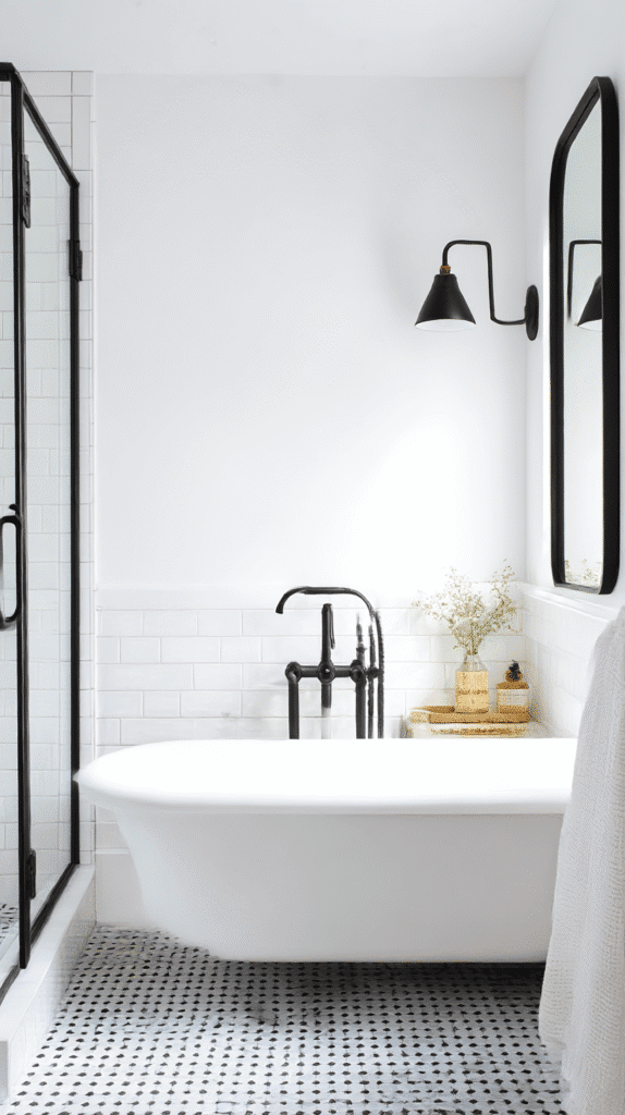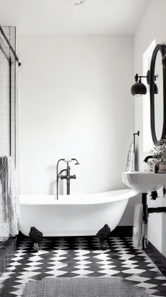 To start your own black and white transformation, begin by identifying a focal piece. Perhaps it’s a sleek black vanity or a bold patterned floor. Work outward from this point.