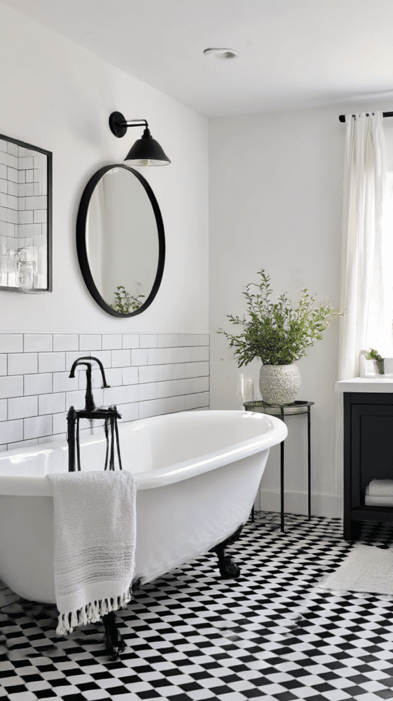 Start by deciding which shade will dominate your bathroom. Many interior designers, like Studio McGee, suggest beginning with a largely white backdrop paired with contrasting black fixtures or accessories. Consider tiling—an opportunity to play with patterns. According to Pinterest Predicts, checkerboard tiles are making a triumphant return this season.