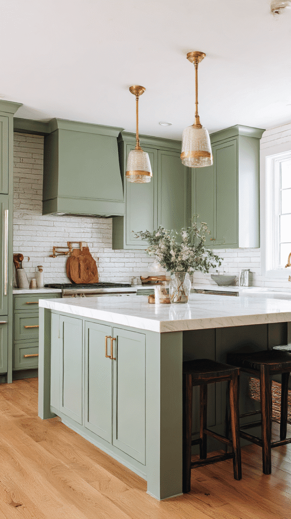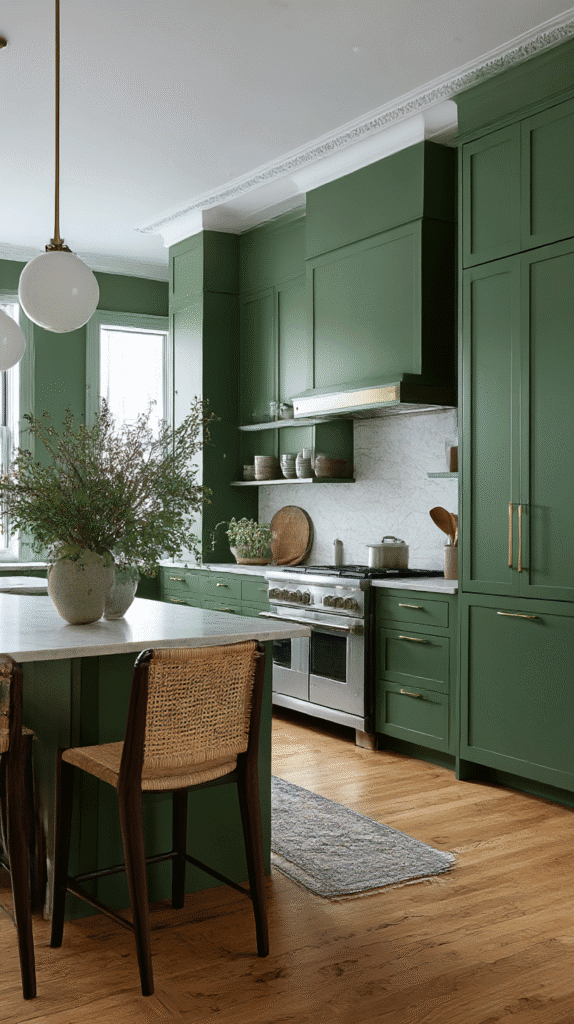 Choosing green for your kitchen cabinets opens up a world of color possibilities. Green is a versatile hue that pairs beautifully with a variety of colors. Classic combinations, such as pairing with white, create a fresh and clean aesthetic. Consider Benjamin Moore’s ‘White Dove’ for upper cabinets or walls to contrast with deeper shades like Farrow & Ball’s ‘Studio Green’ for an elegant yet grounded look.