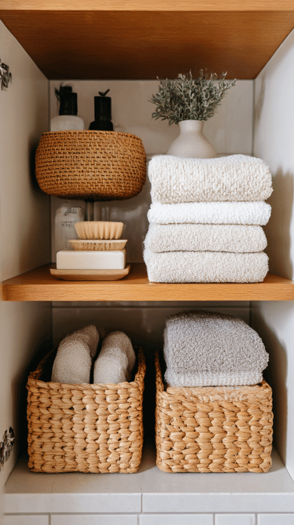 First, find your focal point in the bathroom. Assess your daily routines and prioritize the essentials. This means elegantly paring down: keep only the vital items like a toothbrush, a bar of soap, and your must-have skincare products. Brands like Muji offer sublime storage solutions starting at $25, which embody simplicity and form. Next, employ clear, stackable bins to methodically organize supplies; not only do they maximize vertical space, but they also allow quick visual inventory. Glass jars, too, can elegantly house cotton swabs or bath salts while doubling as décor.