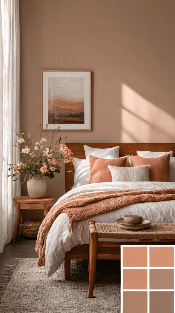 And don’t forget lighting! The warmth of peach and brown shifts throughout the day with natural light. Experiment with sheer curtains to filter sunlight gently, and set the mood with pendant lights in warm metals like brass or rose gold.