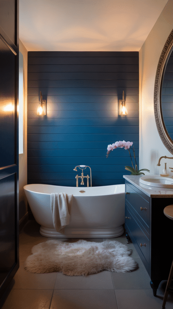 Imagine a small, moody bathroom adorned with deep navy walls. Pairing this with brass accents and soft, yellow lighting can make your space feel more like an intimate retreat than a mere corner in your home.